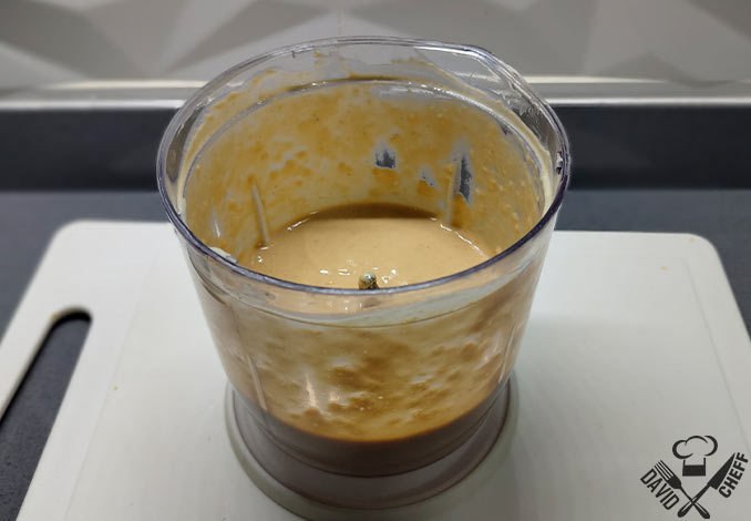 Cortamos la cebolla en juliana y la pochamos a fuego lento hasta que coja color. La retiramos y añadimos la mantequilla y la piel de las gambas hasta que cojan color, incorporamos el brandy y flambeamos. Una vez flambeado incorporamos la nata y dejamos a fuego mínimo una media hora. Colamos con un colador y desechamos las cascaras.