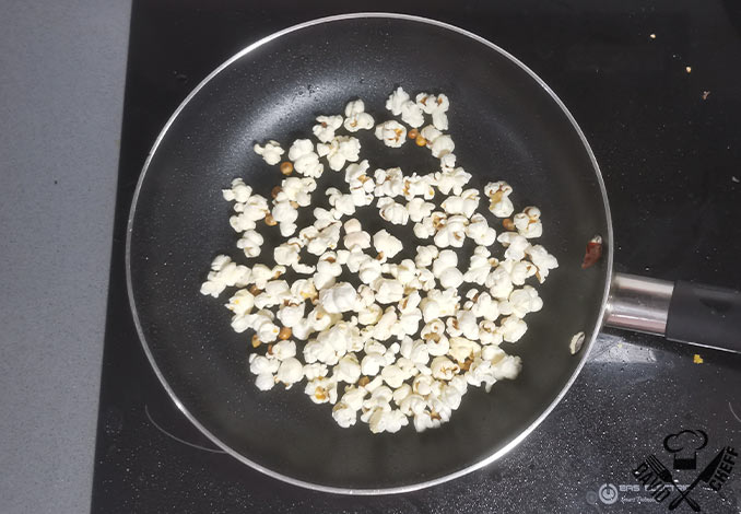 Atravesamos el sashimi con unos pinchos de madera y lo rebozamos sobre primero las palomitas y después el pistacho.